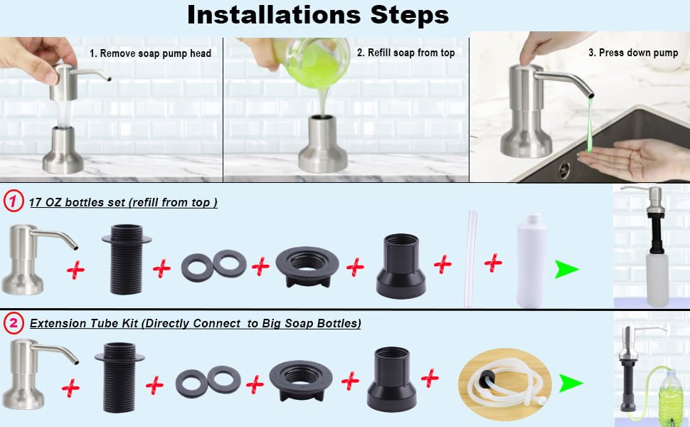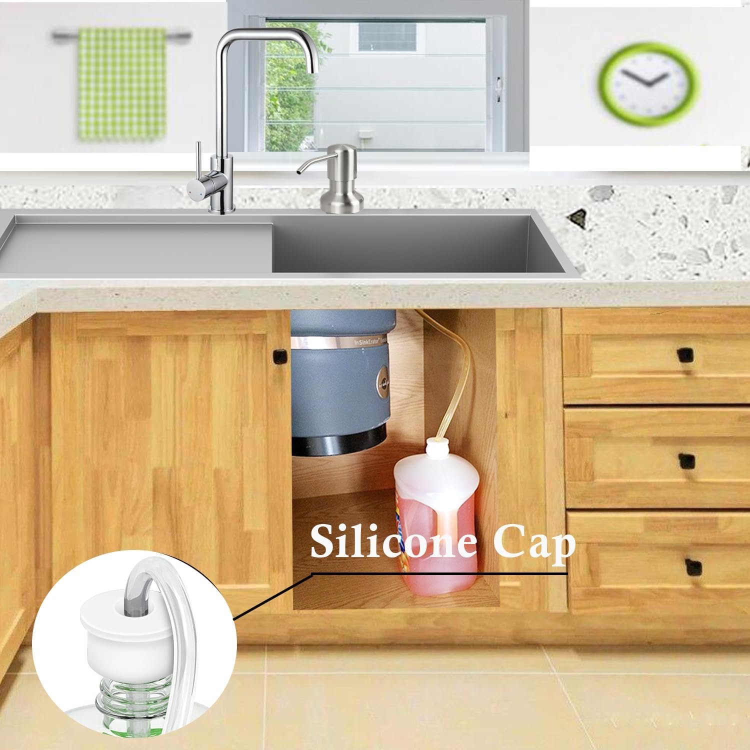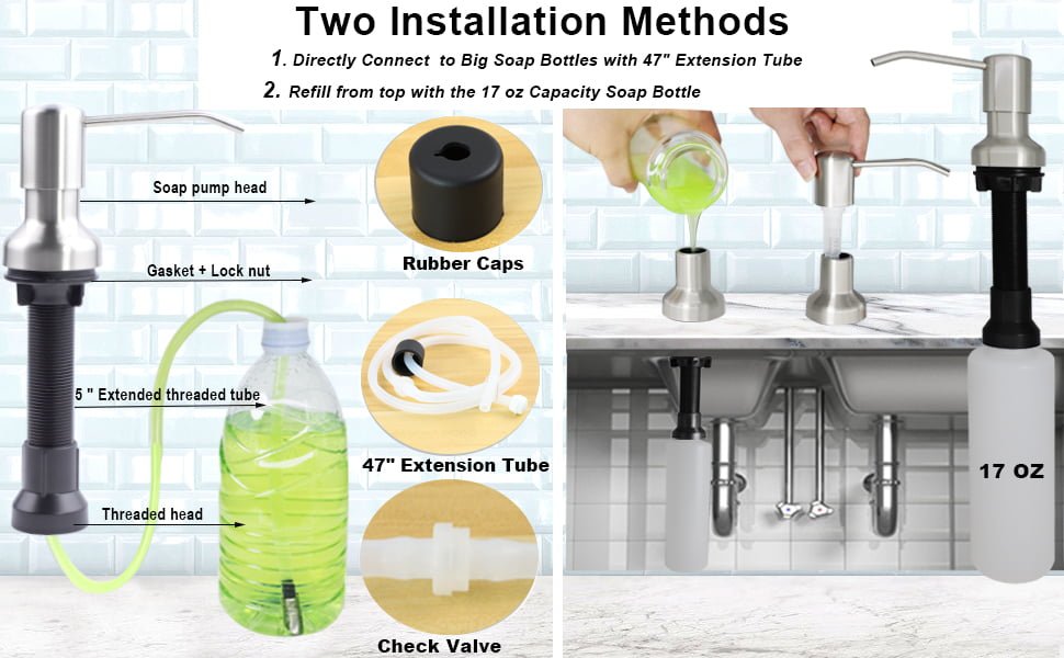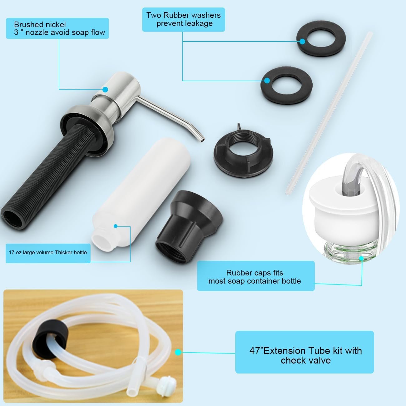 NO MÁS LLENADO CON FRECUENCIA: el dispensador de jabón de níquel cepillado viene con una botella de gran volumen de 17 oz y un accesorio de tubo extendido de 41" para que no tenga que rellenarlo todo el tiempo. Sin desmontarlo, rellene el jabón desde el cabezal de la bomba del dispensador de jabón del fregadero. La bomba de jabón del fregadero está firmemente conectada a un tubo corto, sin fugas.