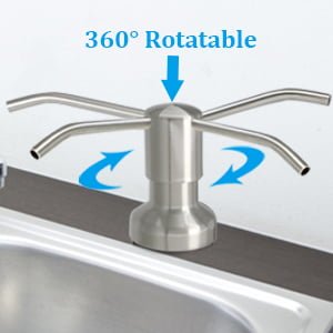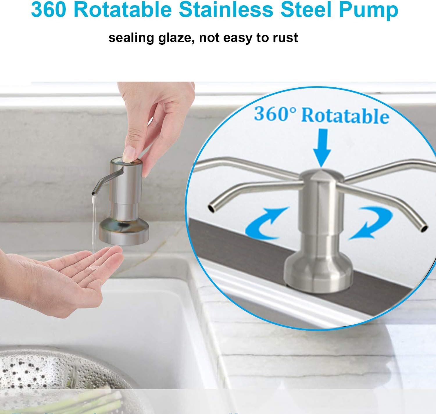 El dispensador de jabón para fregadero de cocina está hecho de acero inoxidable cepillado y ABS interno sin plomo, tratamiento de superficie de esmalte de níquel cepillado, resistente a la corrosión y al óxido. Boquilla extendida de 3 pulgadas (gira 360 grados) para evitar salpicaduras de jabón. El principio aerodinámico hace que la bomba sea fácil de empujar, lo que podría controlar mejor la cantidad de jabón. autocebante y no se atasca ni gotea