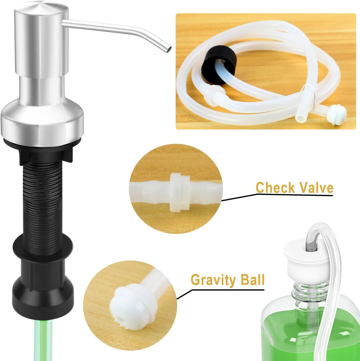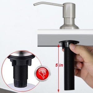 Los dispensadores de jabón para fregadero de cocina con tubo roscado alargado y grueso de 5 pulgadas se adaptan a cualquier profundidad de encimera (granito, acero inoxidable, madera). Con arandelas de goma en ambos lados, no tiene que preocuparse por que se filtre agua.
