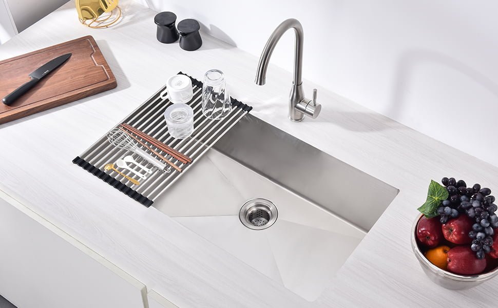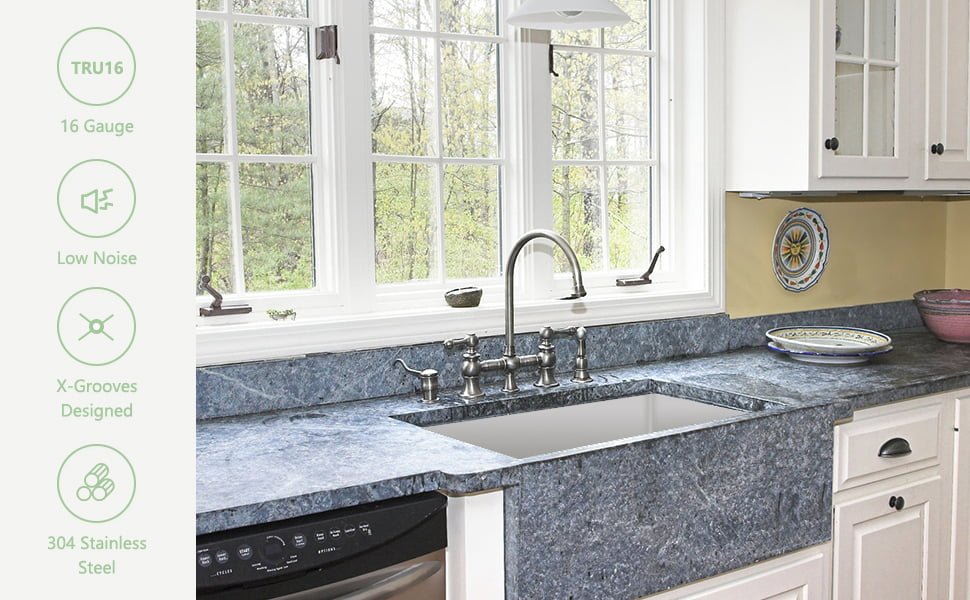 - Acero resistente de calibre 16: fabricado con TRU16, el acero inoxidable más grueso del mercado, este caballo de batalla es altamente resistente a la corrosión y las abolladuras. Acabado resistente al óxido es fácil de limpiar y no se desafila con el uso diario. La rejilla inferior de acero inoxidable protege la superficie del fregadero y mantiene los platos elevados para un drenaje óptimo.