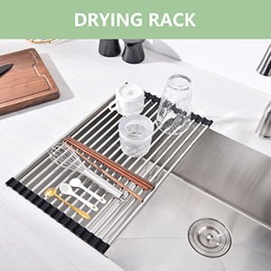 - Juego de fregadero de cocina con reborde integrado en el fregadero para optimizar la preparación y limpieza de comidas sin perder espacio en la encimera de la cocina: el kit de chef de 5 piezas incluye un escurridor enrollable perfecto para enjuagar productos, secar platos y proteger las encimeras de artículos calientes; rejilla inferior, lavabo de drenaje de acero inoxidable 304, colador y cubierta de drenaje.