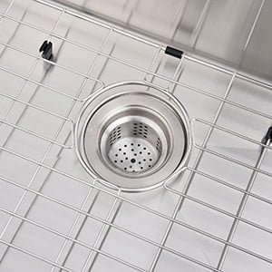 La rejilla inferior de acero inoxidable con parachoques suaves protege la parte inferior de tu fregadero de arañazos y abolladuras y eleva los platos para un mejor drenaje.