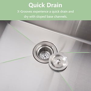 - Diseñado para un fácil drenaje con diseño de ranuras en X que evita que el agua se acumule en el fregadero. Totalmente aislado con aislamiento acústico patentado, incluyendo almohadillas extra gruesas que absorben el ruido y la vibración cuando el fregadero está en uso.