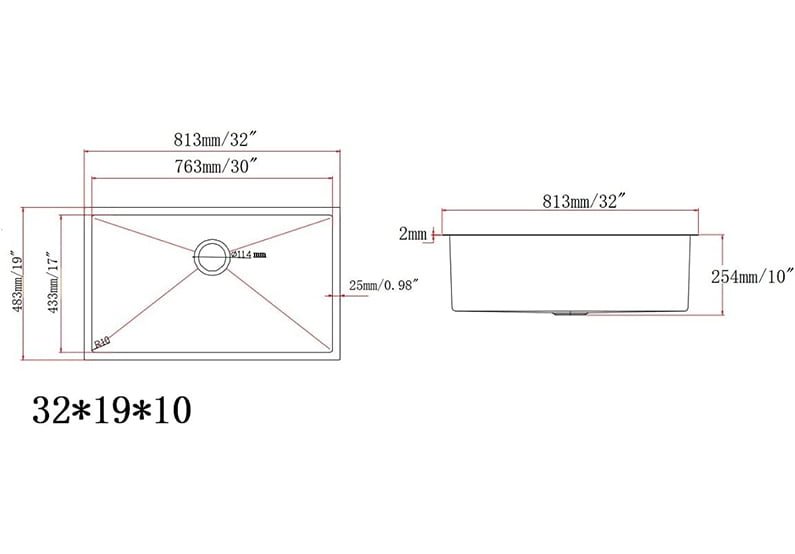 - Dimensiones: 81.3 cm de largo x 48.3 cm Ancho x 25 cm D; Dimensiones interiores: 76.3 cm Largo x 43.3 cm Ancho x 25cm D; Tamaño mínimo del gabinete: 91 cm. Las aberturas de drenaje estándar de 3.5 pulgadas se adaptan a cualquier unidad de eliminación de basura. Maximiza la funcionalidad de tu fregadero de estación de trabajo homfan