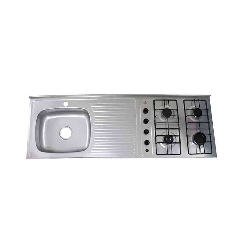 Meson en acero inoxidable, escurridor derecho monocontrol, 150 x 50cm con estufa 4 puestos