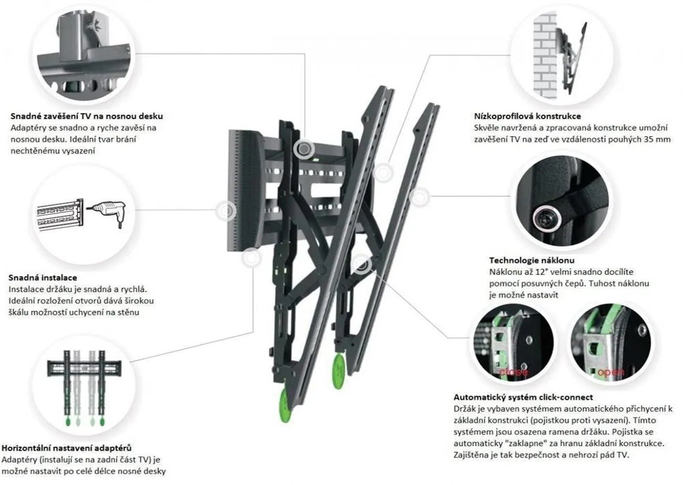 Este diseño de perfil bajo hizo que su televisor de panel plano ultra fino se acerque mucho más a la pared, a solo 35 mm de distancia de la pared. La instalación y el desmontaje fáciles y rápidos hacen que se pueda mover su televisor a una posición diferente. Con nuestro excelente diseño, el modelo tiene una gran competencia en el mercado. El diseño de tecnologías avanzadas hace que el ángulo de visión sea fácil y conveniente. La gestión de cables limpia y ordenada diseñada hace que su conexión de cables sea fácil y sin problemas. Nuestros accesorios estándar le permiten ampliar los orificios de montaje de televisores VESA a 100*100, hasta 400*40 mm. Inclinación de 12 grados