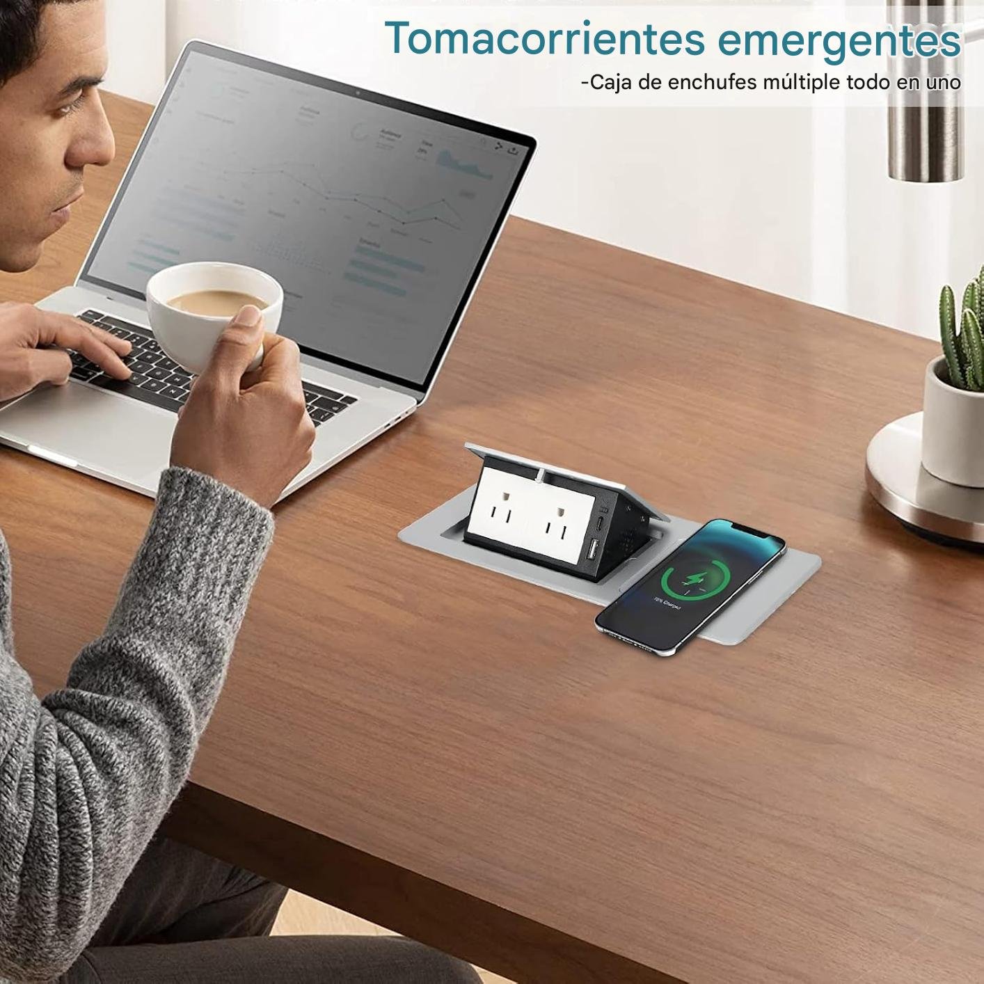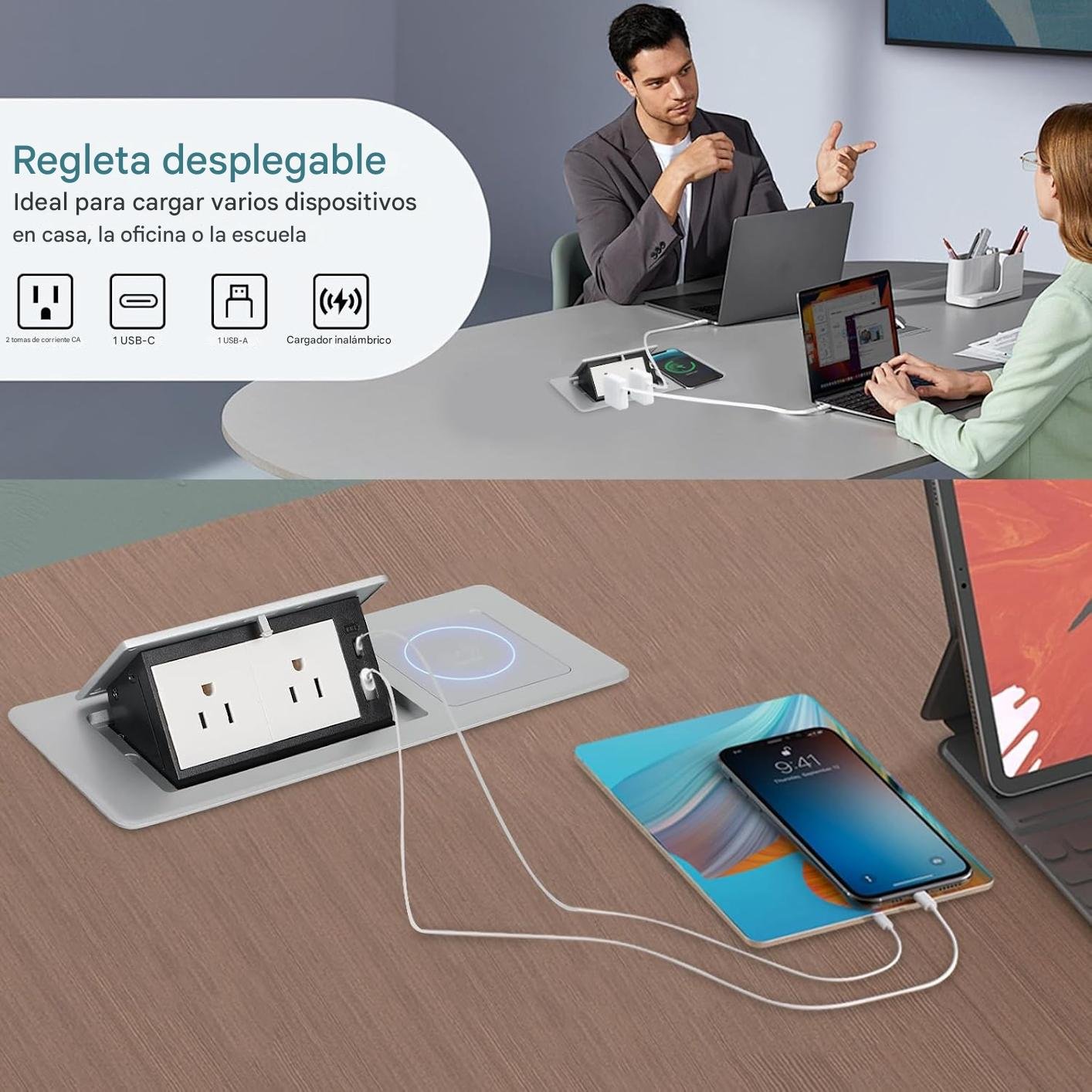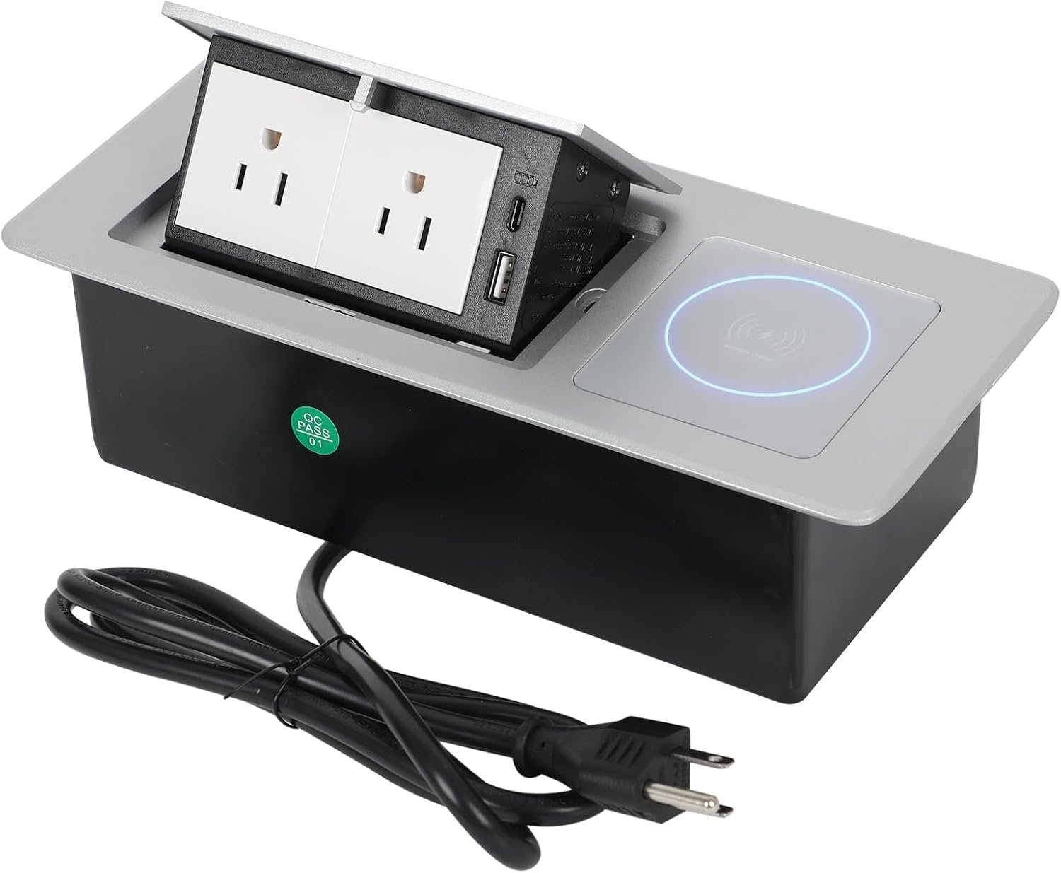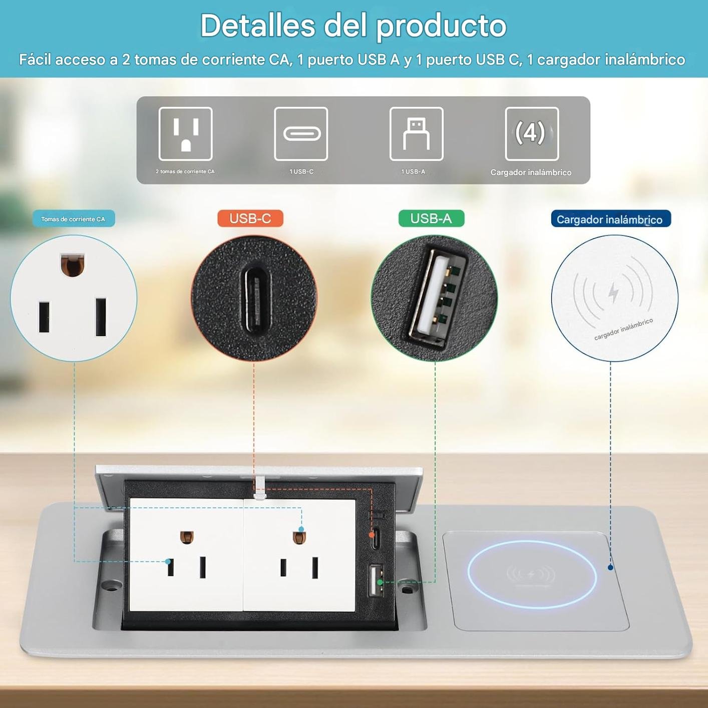 - Configuración del producto: compra este producto y puedes obtener 1 toma de corriente emergente de escritorio, cargador inalámbrico integrado de 15 W, 2 salidas de CA, 1 puerto USB A y 1 puerto USB C, cable de alimentación de 5.9 ft y suficiente configuración para satisfacer las necesidades de carga de tus dispositivos diarios