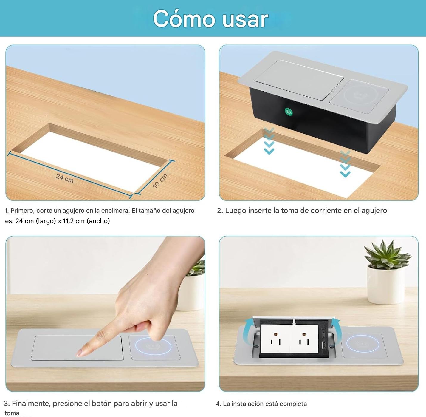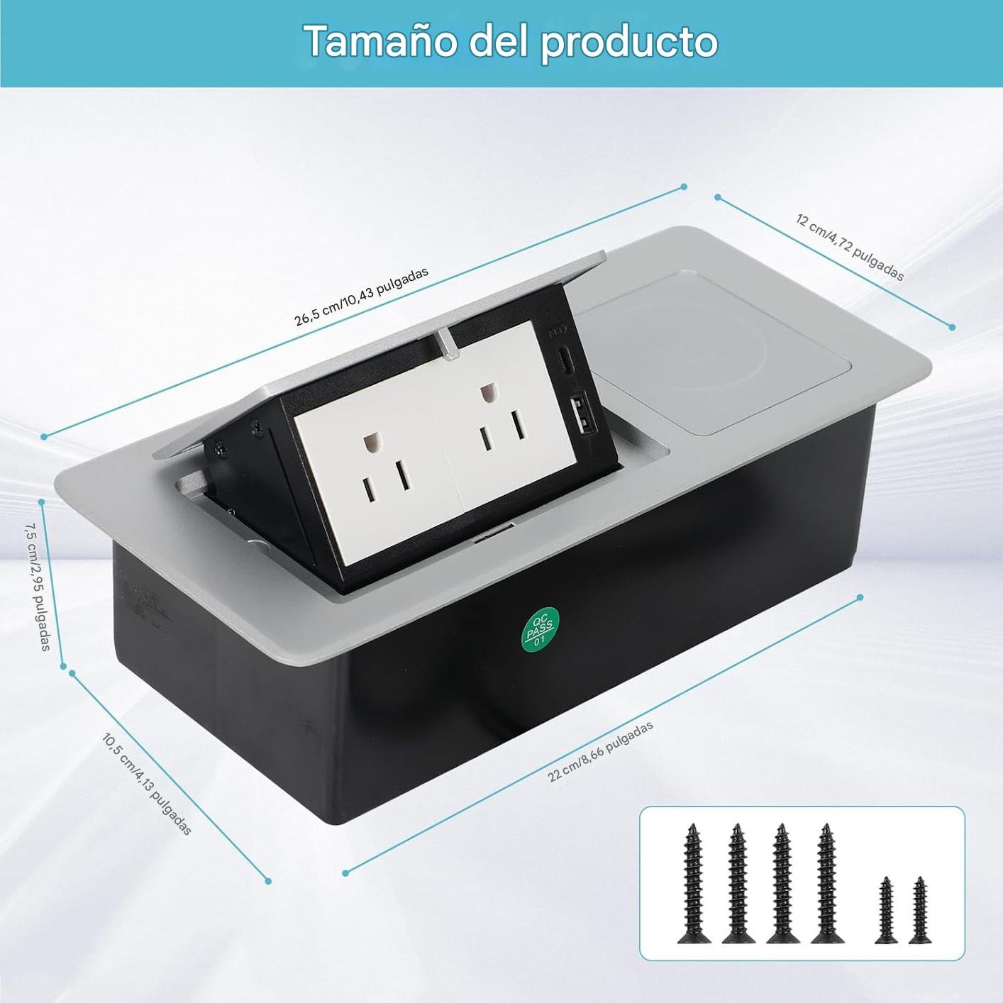 - Fácil de instalar: la caja de conexión de escritorio es fácil de usar y fácil de instalar, cuando quieras utilizar el enchufe de escritorio, simplemente utiliza una sierra de agujero para perforar un agujero de 8.86 pulgadas de largo x 4.40 pulgadas de ancho x 2.55 pulgadas de alto en la ubicación deseada, y luego instálala desde la parte superior